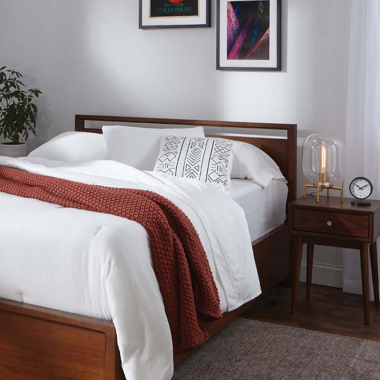 Mid-century modern style features clean lines, warm woods, and pops of bright color. Look for tapered legs; atomic accents; and upholstery in shades of orange, teal, and yellow.