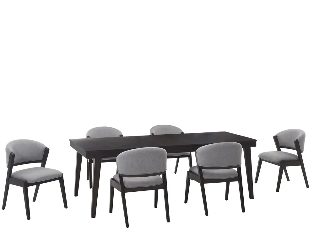 The essentials of a sleek and stylish dining space are yours with the Alexander dining set. Including seating for 6 in upholstered, armless seats around the handsome tobacco wood table, this set welcomes you to expand your hosting with the self-storing leaf included.