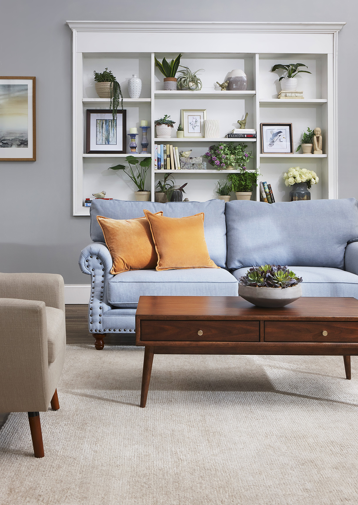 For a regular sofa, a round, oval, rectangular, or square coffee table works well. You can place two smaller square coffee tables together to create a greater sense of balance. Depending on your sofa configuration (for example, a L-shape sectional), a round ottoman can be a good pick. For sectionals, pay attention to the room’s size, making sure there is enough space to move in and around the sofa. You can also place a coffee table with a pair of chairs for an attractive arrangement.